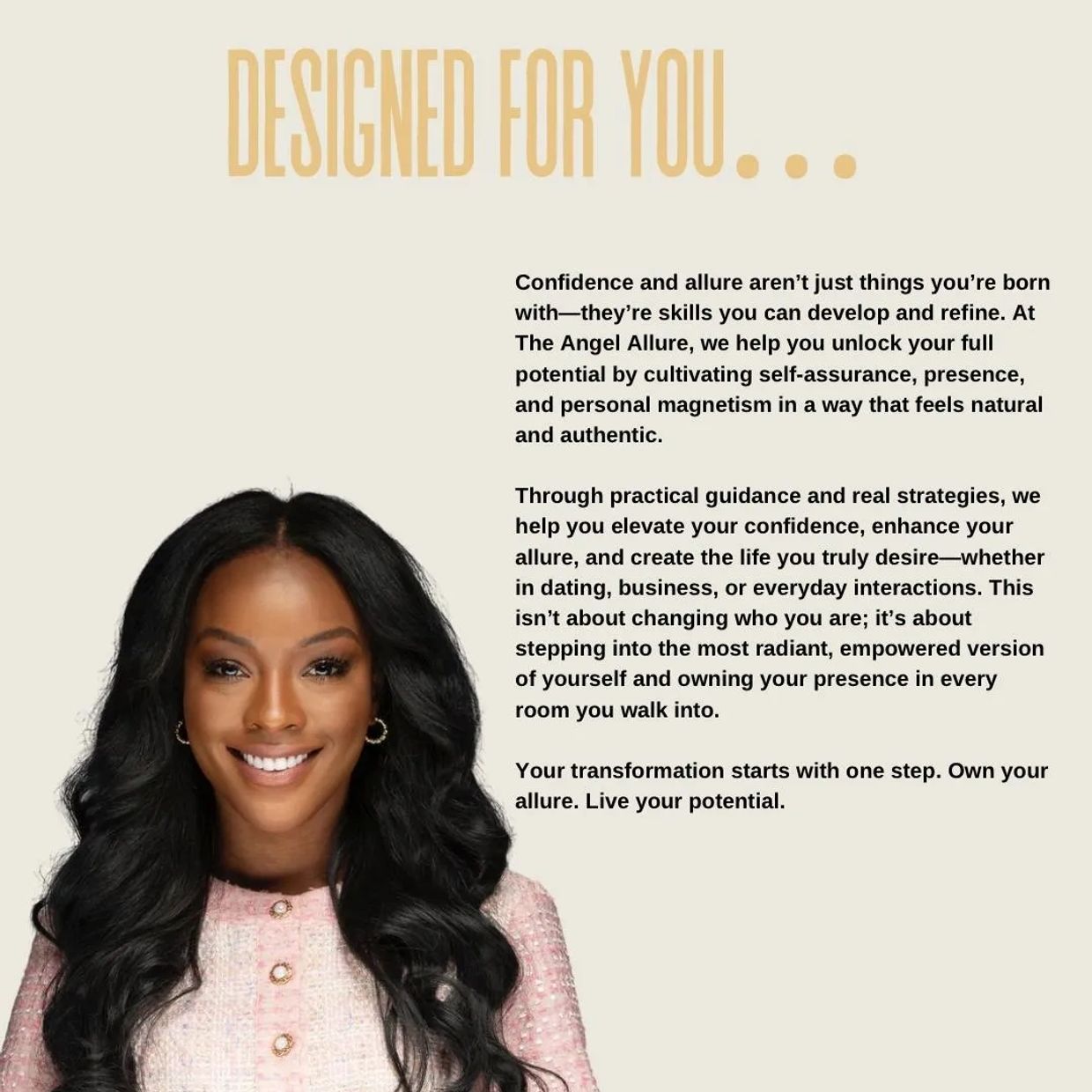 The Angel Allure method is a step-by-step transformation designed to refine your energy, elevate your presence, and help you navigate life with effortless confidence. Through a combination of mindset shifts, strategic refinement, and personal branding, we help clients enhance their magnetism, presence, and effortless attraction.